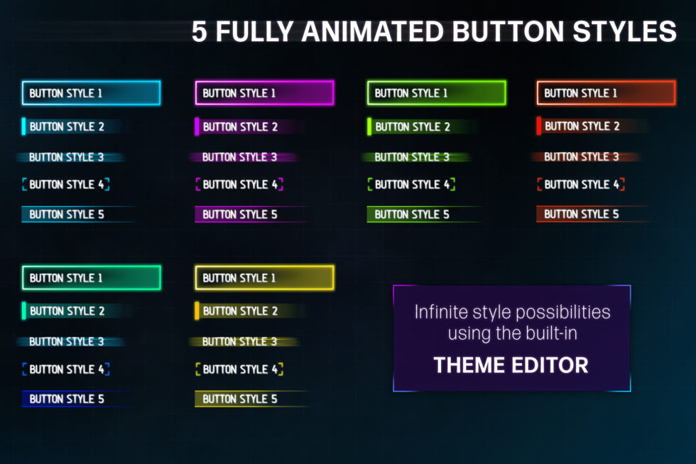 A flexible menu for the Unity game engine Asset Store that dynamically adjusts to various screen resolutions, requires no code changes by the user to customize the layout, as well as includes a custom theme editor for easy color and style adjustments.