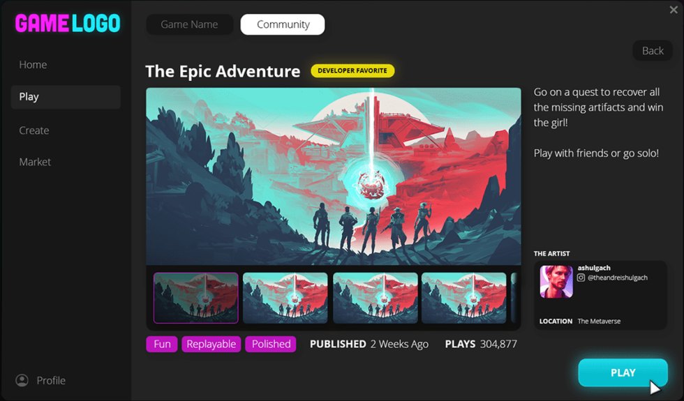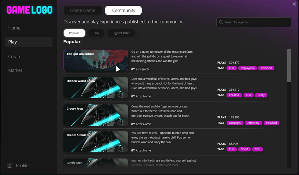 I created a modern and intuitive yet familiar design for a game launcher. This entailed the development of a custom editor for community content and the establishment of a hub where the discovery of new content is curated through a unique rating system, prioritizing encouragement and praise.